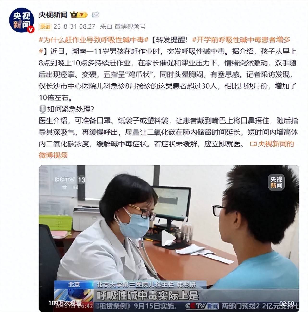 这几天,全国的中小学陆续开学了,而就在开学前夕,医院急诊的“呼吸性碱中毒”病例也变多了。
